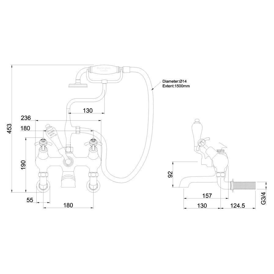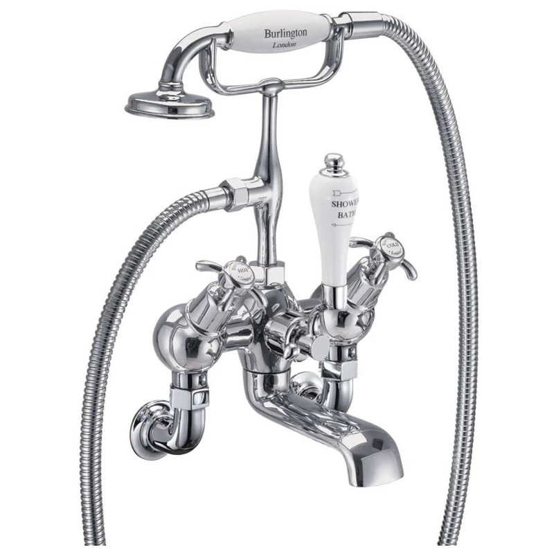 Consists of 1 x Angled bath shower mixer (Including the standard cradle, āSā adjuster, Claremont, Anglesey & Birkenhead divertor handle, hose, ceramic telephone handset , excluding tap heads, base and unions) (T9), 1 x Wall mounting unions (for Bath Shower Mixer & Bath Filler, 3/4) (T17-2) and 1 x Anglesey tap handles (pair) (T2)