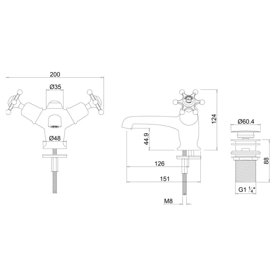 Consists of 1 x Basin mixer with pop up waste (T12), 1 x Click-clack basin waste (W11) and 1 x Birkenhead tap handle (pair) (T3)