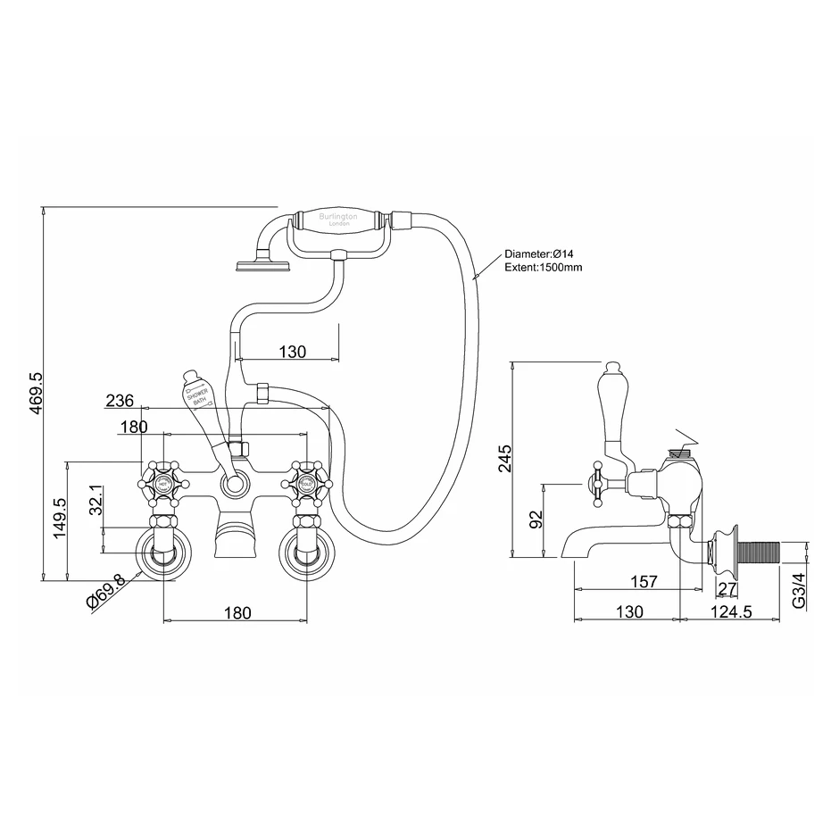 Consists of 1 x Bath shower mixer (Including the standard cradle, āSā adjuster, ceramic diverter, hose, ceramic telephone handset, excluding tap heads, bases and unions) (T8), 1 x Wall mounting unions (for Bath Shower Mixer & Bath Filler, 3/4) (T17-2), 1 x Birkenhead tap handle (pair) (T3) and 1 x Regent large pair of tap bases (for bath taps, bath shower mixers & bath fillers ā pair) (T4A)