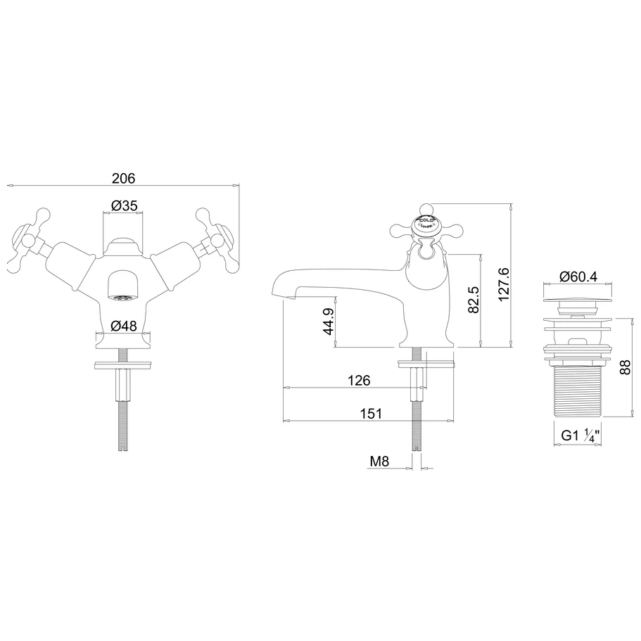 Consists of 1 x Basin mixer, with pop up (excluding tap heads & base) (T12), 1 x Click-clack basin waste (W11) and 1 x Claremont tap handles (pair) (T1)