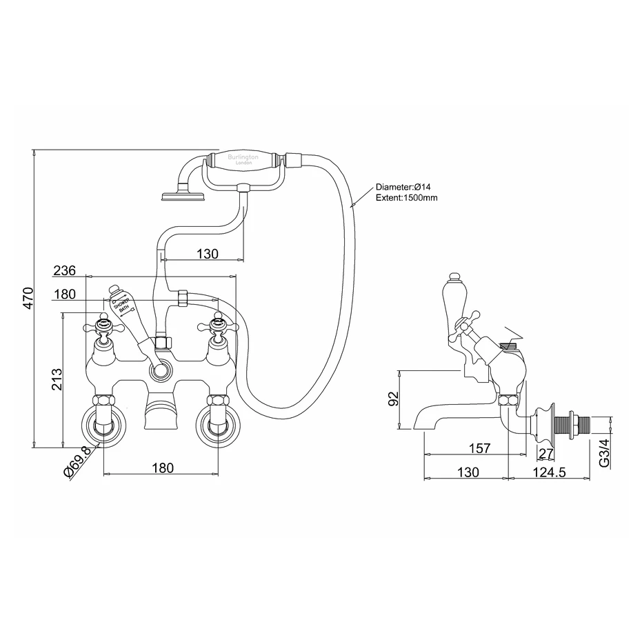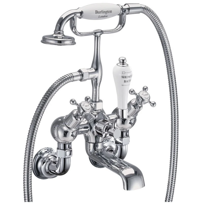Consists of 1 x Angled bath shower mixer (Including the standard cradle, āSā adjuster, Claremont, Anglesey & Birkenhead divertor handle, hose, ceramic telephone handset , excluding tap heads, base and unions) (T9), 1 x Wall mounting unions (for Bath Shower Mixer & Bath Filler, 3/4) (T17-2), 1 x Claremont tap handles (pair) (T1) and 1 x Regent large pair of tap bases (for bath taps, bath shower mixers & bath fillers ā pair) (T4A)