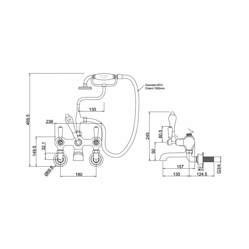 Consists of 1 x Wall mounting unions (for Bath Shower Mixer & Bath Filler, 3/4) (T17-2), 1 x Regent large pair of tap bases (for bath taps, bath shower mixers & bath fillers ā pair) (T4A), 1 x Quarter turn bath shower mixer (Including the standard cradle, āSā adjuster, ceramic diverter, hose, ceramic telephone handset, excluding tap heads, bases and unions) (T8-QT), 1 x Kensington tap handles (pair) ā chrome & medici (T4 MED), 1 x Medici shower handset (ME11-1) and 1 x Medici diverter handle (ME10)