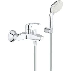 The Grohe Eurosmart wall-mounted single-lever bath mixer set is a delight to use β switching from bath filler to the Tempesta 100 hand shower is easy using the handy diverter. Grohe DreamSpray ensures the flow of water from every nozzle is even β perfect for enjoying the hand showerβs soothing Rain Spray β and the silicone SpeedClean nozzles are easy to keep free of dirt and limescale. The Grohe EcoJoy 9.5 litre/minute flow limiter guarantees a powerful spray while saving you water and money. The tap has a solid metal lever and the Grohe SilkMove ceramic cartridge delivers precise volume and temperature control for a lifetime. Finished in dazzling but hardwearing Grohe StarLight chrome, this set will stay looking pristine for years to come. The hand shower which comes with a 150cm Relexaflex hose and wall holder.