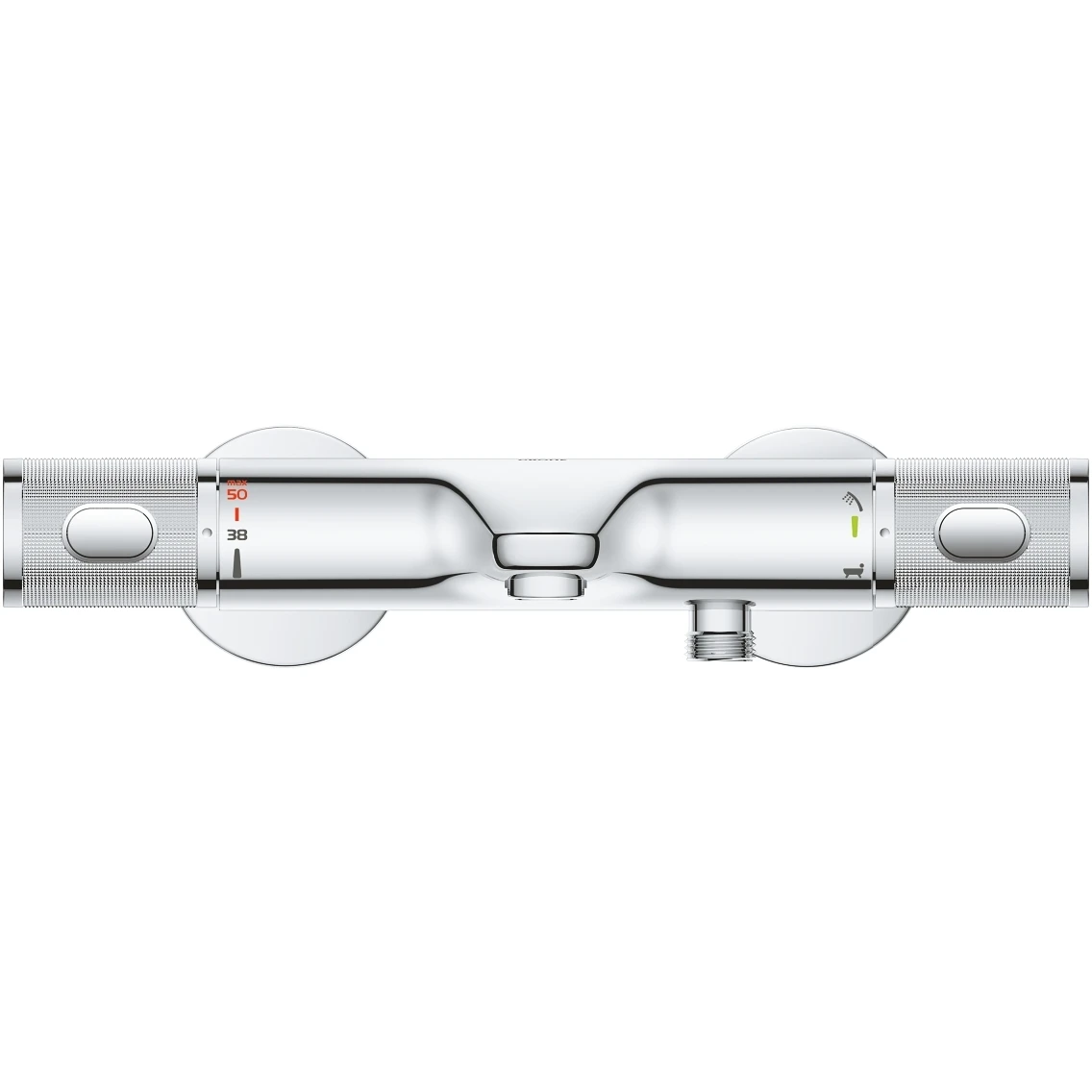 Grohtherm 1000 Performance Thermostatic bath mixer – ergonomic control for your bath and shower with safety and eco features. Upgrade to the benefits of thermostatic technology with this wall-mounted exposed thermostatic mixer with bath spout and bottom shower outlet, offering enhanced convenience and safety. Its slimline cylindrical silhouette is sleek and minimalist, down to the escutcheons. It’s easy to control too, even with wet or soapy hands – Grohe ProGrip ergonomic handles have a knurled surface for great grip. 100% Grohe CoolTouch ensures the body of the mixer never gets too hot to touch, due to an inner cooling channel. Grohe TurboStat technology lets you enjoy water that is always at the ideal temperature, with no fluctuations. Safety comes as standard too, making it an ideal choice for family bathrooms – children are prevented from turning the temperature up too high thanks to the Grohe SafeStop override button, set at 38°C, and the Grohe SafeStop Plus temperature limiter, which can be set to a further limit of 50°C. The mixer has an effortless water-saving feature, in the flow-reducing Grohe EcoJoy function. This chic mixer is finished with the durable Grohe StarLight, for long-lasting sparkling looks.