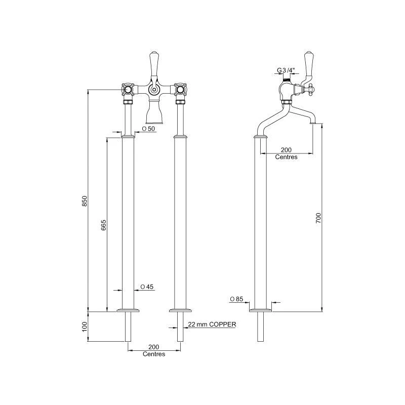 Georgian Exposed Floor Mounted Bath Shower Mixer Tap with Cross Handles, Chrome